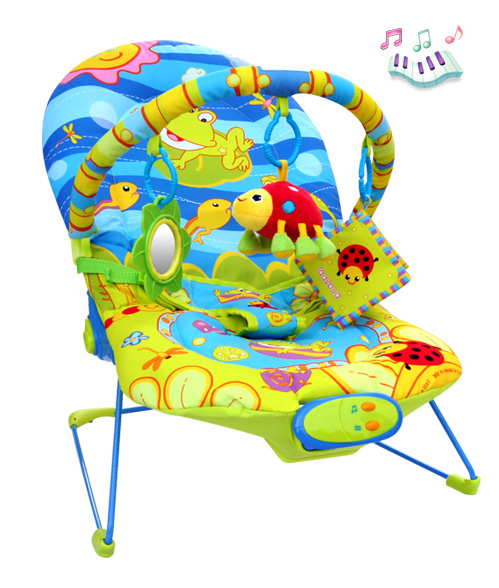 Шезлонг со съёмными игрушками, с муз. панелью (7 меняющихся мелодий), работает в совмесном режиме музыка+вибрация. Работает от 2 батареек АА (в комплект не входят). В подарочной упаковке. С трёхточечными ремнями безопасности, для детей до 9кг. Размеры в разложенном виде 66х50х51см; размер упаковки 49.5х8х32.5см