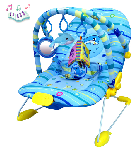 Шезлонг с муз. панелью (7 меняющихся мелодий), вибрацией. Работает от батареек АА (в комплект не входят). Размеры в разложенном виде 66х50х51см. Производство - Китай.