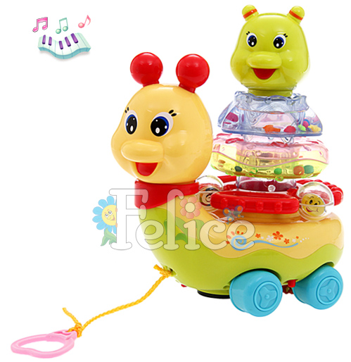 Красивая игрушка с погремушками, которые собираются в пирамидку. Игрушку можно катать за веревку (в комплекте) или она может передвигаться сама преодолевая все препятствия. Головы гусениц вращаются, пирамидка подсвечивается, включается музыка. Игрушка Felice cпособствует развитию моторики, мышления, изучению цветов и форм, восприятию звуков.