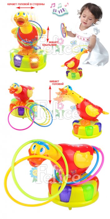 Отличная игрушка для физического развития, координации движения и меткости. Утка сама катится, машет крыльями, качает головой вверх, вниз, в стороны, ребенок должен одеть все кольца на шею утки. Кроме того игрушка музыкальная и светится.
