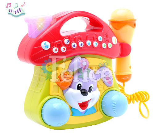 Игрушка для маленьких меломанов, на каждой кнопочке записана определенная мелодия, мигает труба у теремка. В комплекте микрофон, которые отстегивается, с ним дети себя почувствуют настоящими артистами. Это отличная игрушка для развития у детей моторики, музыкального слуха, памяти, помогает изучать цвета и формы.