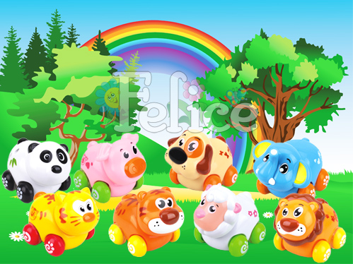 Забавные зверята (слон, тигр, лев, панда, баран, собака, кот и поросенок). Игрушка механическая, во время движения у животных качаются головы.