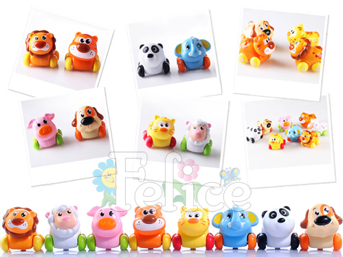 Забавные зверята (слон, тигр, лев, панда, баран, собака, кот и поросенок). Игрушка механическая, во время движения у животных качаются головы.