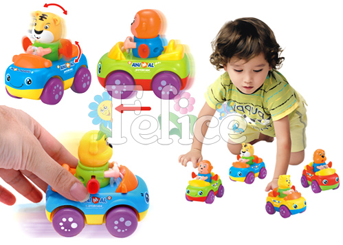 Забавные водители в виде различных зверушек за рулем машинки. Машинка механическая, во время движения у водителя машинки двигаются ножки и качается голова.