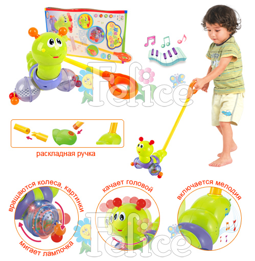 Гусеница крутит головой, на колесиках бубенчики, внутри колес вращающиеся картинки и мигалки. Включается музыкальный режим. Ручка снимается и раскладывается на две части.
