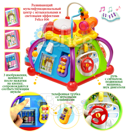 Очень интересный центр с множеством функций и звуков. Есть караоке с микрофоном, руль с машинкой, имитацией движения, лабиринт, барабан, аквариум с водой и подсветкой, в котором плавают морские персонажи. Есть окошко с тремя меняющимися картинками, например отображается спящий ребенок и можно услышать его храп. Это отличная игрушка для развития у детей моторики, мышления, памяти, помогает изучать цвета и формы, различать звуки, сопоставлять с картинками.