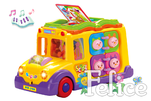 Игрушка Felice способствует развитию моторики, мышления, изучению цветов и форм, восприятию звуков. В кабине автобуса качаются человечки. Мигают фары, играет музыка.