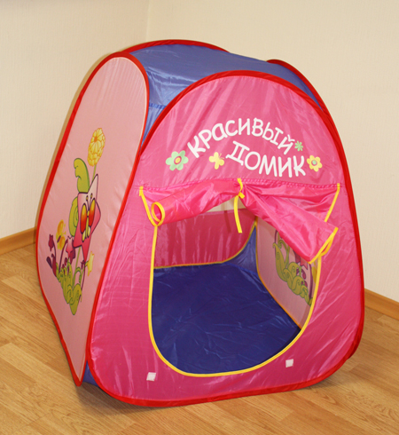 Домик-палатка для детей от 3х лет. Игровая палатка из легкой водонепроницаемой ткани, грязь легко смывается влажной тряпкой. Ткань из безопасного, экологически чистого материала, воздухопроницаемого. У палатки один вход со шторкой и 1 прозрачное окно. Размеры 73х71х83см.